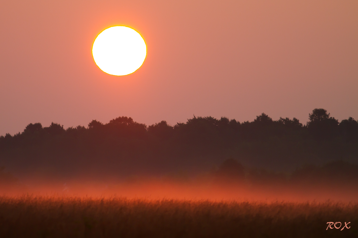 Ühel suvehommikul tervitas tõusev päike just säärase kauni valgusega. Heinamaal olev uduvaip värvus seeläbi kenasti punaseks.