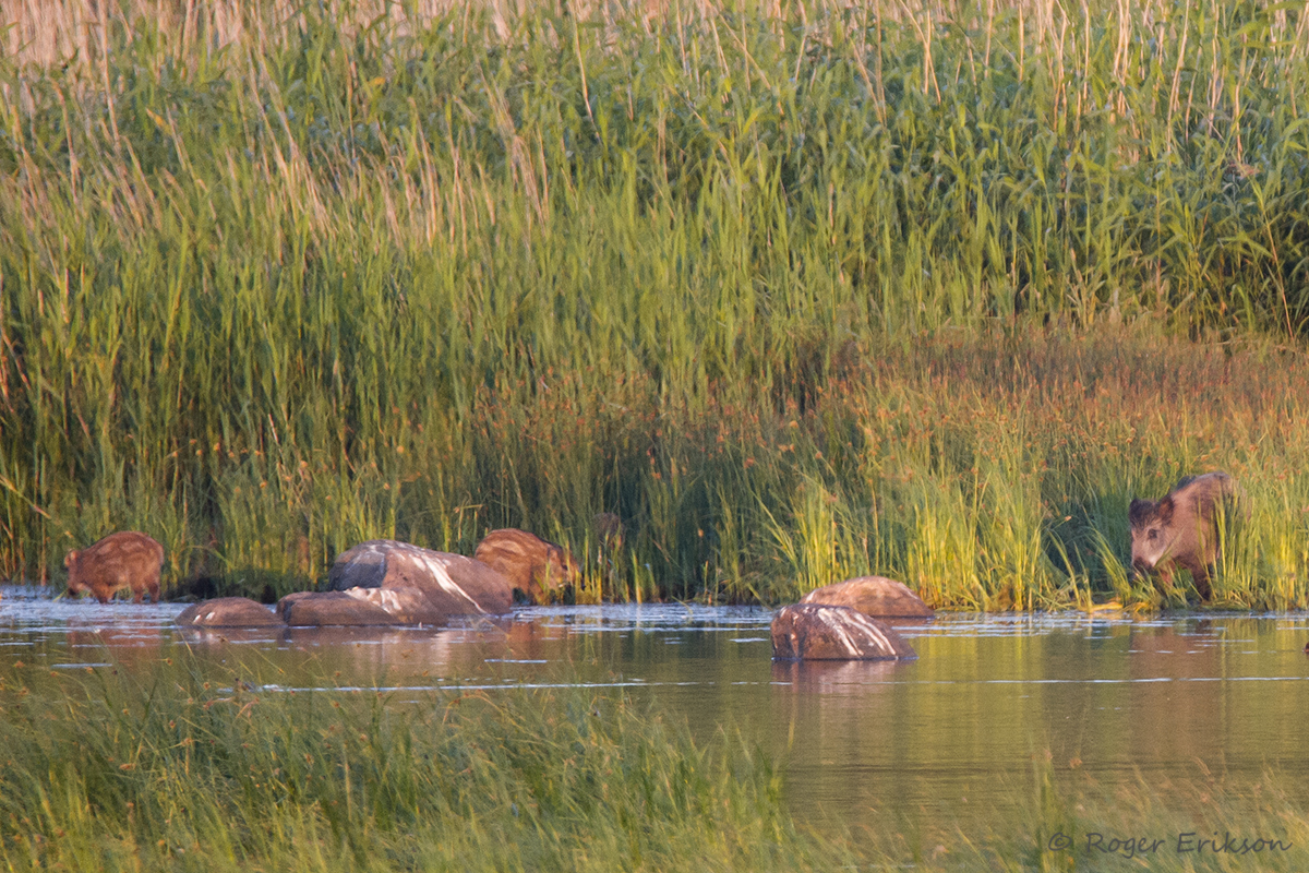 Tänane varahommikune retk mere äärde kujunes taaskord väga ootamatult põnevaks. Oma lemmikkohta taas sammud seadnud, teadsin, kust leida Hall-haigruid. Olin neid just nädalapäevad tagasi samas kohas pildistanud. Kaugelt vaatasin, et haigruid oli lahesopis päris palju, ca 20 lindu. Kui varasemalt on hommikust varitsemist seganud küll pilvine ja vihmane ilm, või teised loodushuvilised (looduspiltnikud), siis ka sel korral olid just selle kõige magusama päikesetõusu valguse ajal mul segajad platsis. Olen palju näinud seal rannal erinevate loomade jälgi, ning seekord sai siis ilmsiks nende autor(id). Tegu oli seakarjaga, nägin kaugelt vaid musta kogu, mis rannakividest värvuse poolest eristus. Hiljem fotoka ekraanilt tuvastasin veel 5 põrsast.