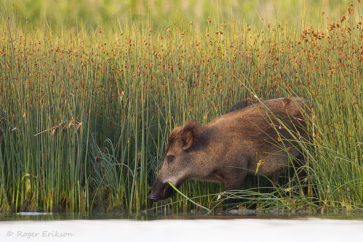 Olles teadlik põrsastega metssea võimalikust rünnakust, seadsin sammud sellest hoolimata nende pool, lootes, et nad liiguvad mööda rannaäärt mulle vastu. Kuna rannikul oli olla hirmus, ja tõtt-öelda sealt roostikust poleks nagunii midagi näinud, tundus ainuõige lahendus minna umbes 30m kaugusele liivasaarekesele :). Viskasin seal siruli ja jäin ootele, endal pisut kõhe ja närviline olemine. Kuulsin, kuidas sead roostikus ragistavad, ise samal ajal silmates, kui palju haigruid antud sopis tegutses ning millest ma seetõttu ilma olin juba jäänud. Kuid lootes siiski näha siga, olin kannatlikult paigal. Peagi tuligi nähtavale peakagelane ise, suur ja võimas, ise täies rahus värskeid rookõrsi krõbistades. Samal ajal aga toimus temast 15m kaugusel igavene tagaajamine ning notsuralli. Oli kuulda vaid roostikuraginat :). Pildi peale põrsad kahjuks tulla ei tahtnud. Õnneks oli tuul mulle soodne ja jäin avastama kuni lõpuni. Lõpuks sain ka oma varitsespaika minna, kuid ikkagi oli kuidagi kõhe, teadsin, et nad on kuskil lähedal, kuna kohati oli kuulda veel raginat ja röitsusi. Igal juhul eriline vaatepilt minu jaoks, sead mererannal ja loomulikult ka esimene pilt metsseast :D. Kuid kindel on see, et enam ma seal nii julgelt ringi ei liigu, kui varasemalt :). Üks pilt kõrsi närivast metsanotsust siin.