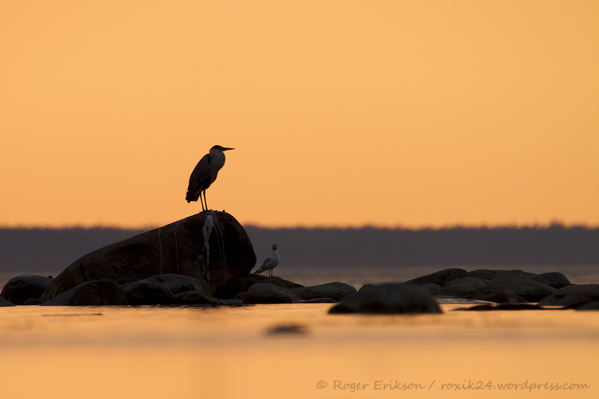 Hallhaigur ja naerukajakas nautimas viimast päikesevalgust. Juuli 2014