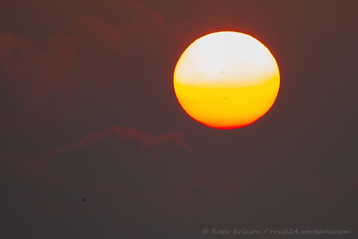 Pilt pilvedesse loojuvast Päikesest. Läbi atmosfääri filtri paistavad päikselaigud ka kenasti välja (ei ole sensorisodi 🙂 ).