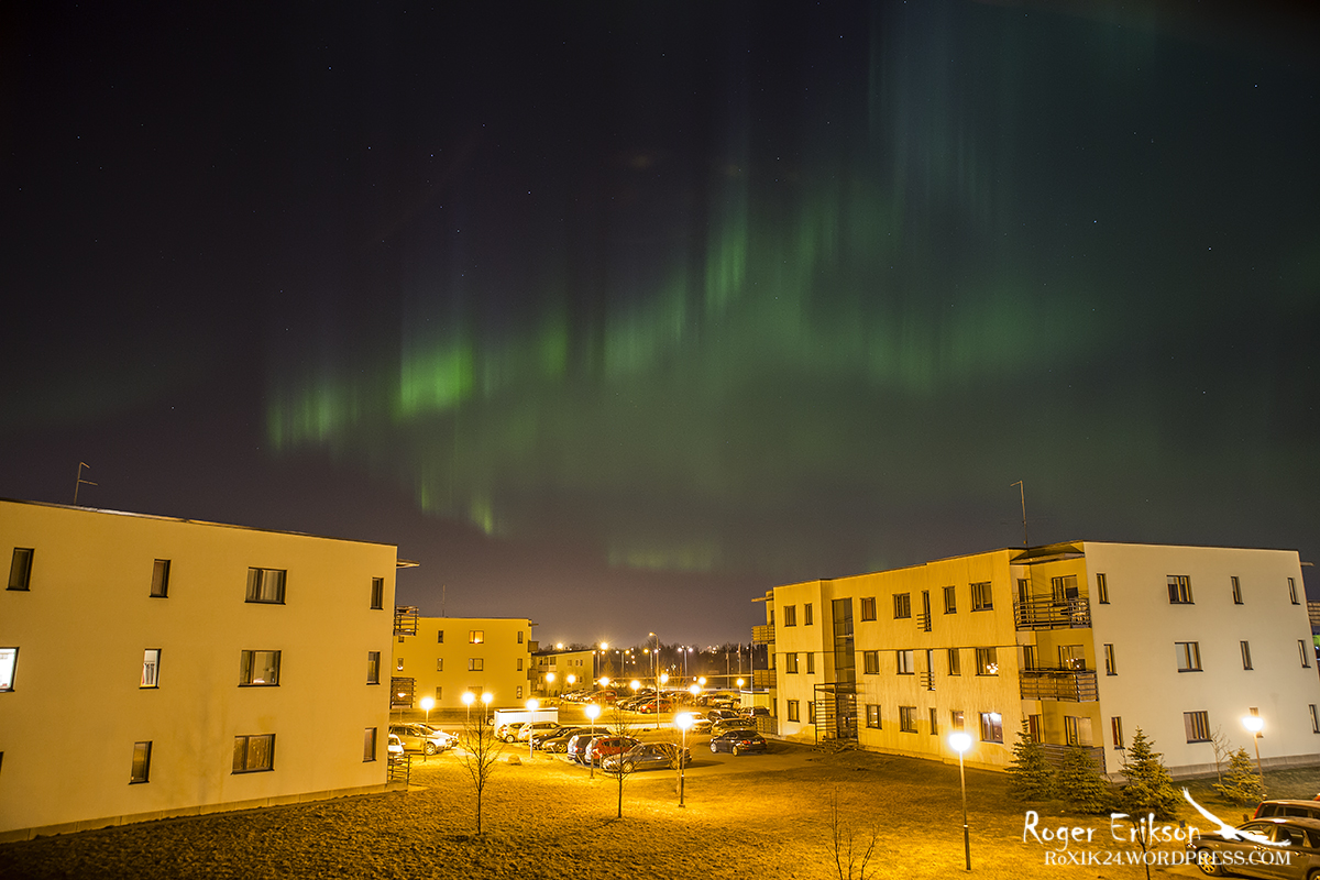 Tulles taas selle unustamatu öö juurde (17-18.märts.2015), lisan veel tagantjärgi ühe pildi, mis õnnestus enne magamaminekut kodust rõdu pealt teha. Olgugi, et tänavavalgustuse kuma on öösel eriti tugevalt näha, võis palja silmaga taevas Virmaliste mängu nautida. Ilmselt parim vaade, mida oma kodu rõdult üleüldse näinud olen :).