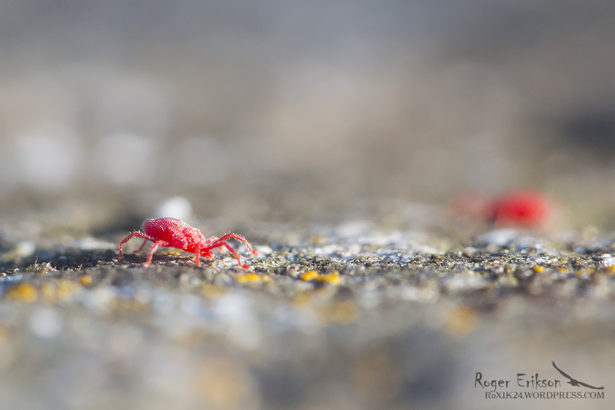 See on vist väikseim putukas, keda kunagi fotokaga taga ajanud olen. Nad on väga raskesti märgatavad, vaid nende erkpunane värvus reedab nende olemasolu :). Oli suur väljakutse teda pildile saada. Tavapärase makro-objektiiviga on neid isegi raske korralikult jäädvustada. Koos vaherõngastega see mul kuidagi ikka õnnestus, kuid jäi ikka liiga “kaugeks” :). Sametlest on 1-2mm suurune ämblikulaadne putukas. Taustal üks liigikaaslastest :).