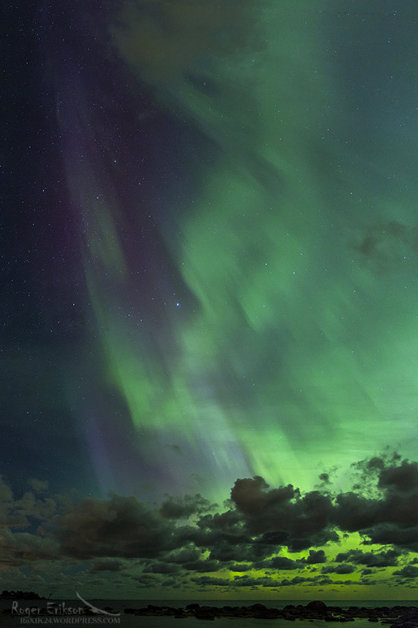 Jätkates virmaliste piltide nädalaga, näitan täna pilti sellest hetkest, kui show minu jaoks käima läks. Tegelikult oli üks suur purse ka kuskil 21 ja 22 vahel, kuid mina jõudsin randa alates 22.00 ja minu jaoks õhtu võimsaim pauk käis siis kuskil 23.28 paiku, kui virmalised järsult aktiveerusid. Taevas läks üliheledaks, ööst sai justkui päev, rannal võis rahulikult ilma taskulambita liikuda :). Virmaliste sambad ulatusid pea kohale välja, otsustasin seekord teha panoraami mitte küljelt küljele vaid nina eest ja kuni üles pea kohale taevasse. Ehk esimene pilt sai tehtud vee pinnalt ja viimane oli tegelikult päris pea kuklas tehtud.