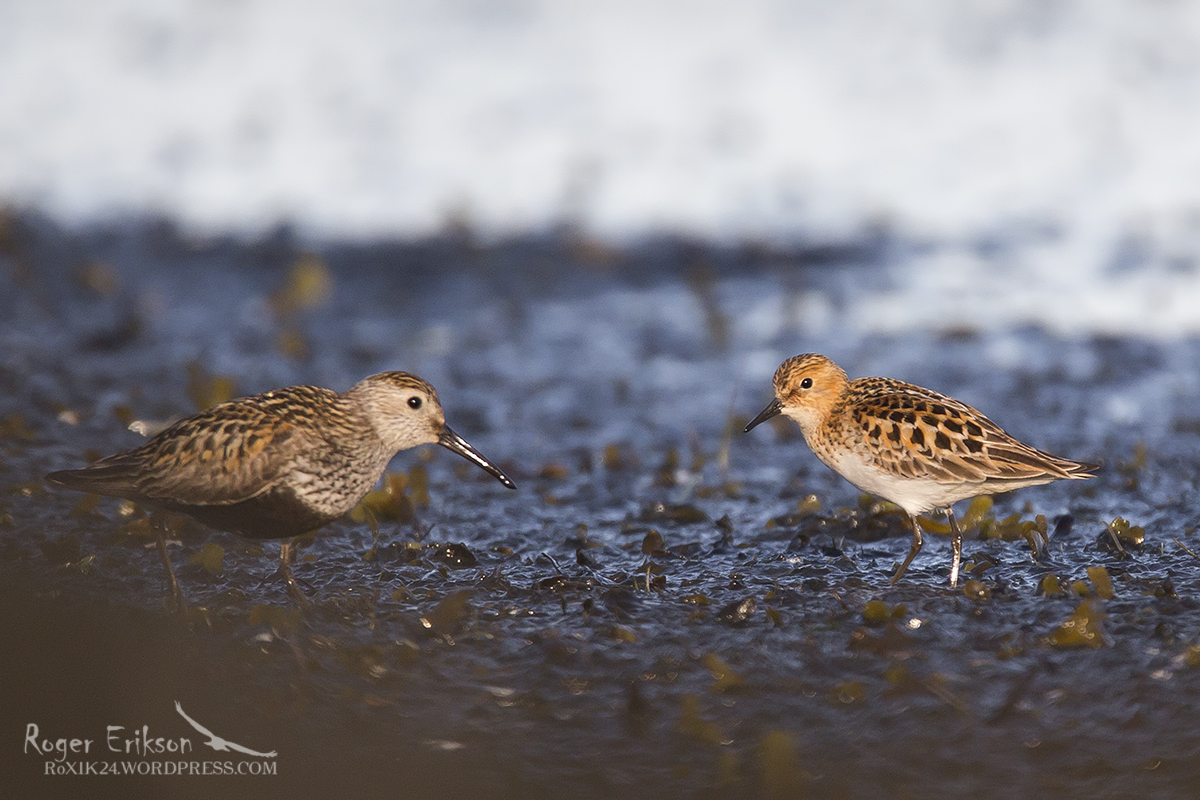 Soorüdi (vasakul) ja väikerüdi (paremal) usinalt enne rändele asumist rannikul toitumas. Minu esmakordne kohtumine väikerüdiga.