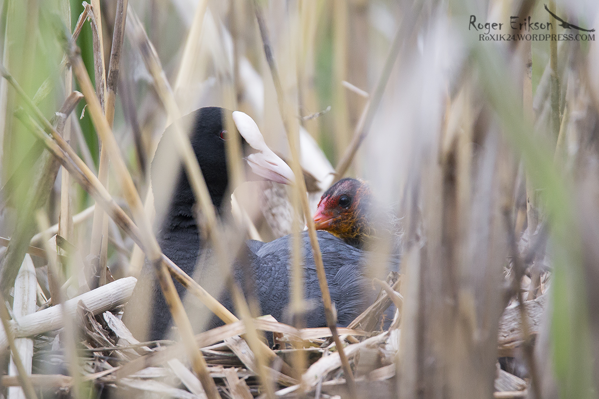 Eelmise aasta Juunis leidsin läbi juhuse kõrkjate seest Laugu pesa, kus parasjagu kerget uinakut tehti. Näha oli vaid üks tibu, võimalik et teised olid kuskil peidus või mujal, sest sama tiigikese peal liiguti 3-kesi ringi :). Täpselt nii, nagu mina Lauga “magamistuppa” piilusin, piilus tibu vanalinnu sulgede vahelt ka mind :). Vahepeal tuli sealt välja, siis jälle läks tagasi peitu :). Pilt tundub tehtud üsna lähedalt, tegelikult oli meie vahel umbes 20m õhku ja asi liiga intiimseks ei läinud ;).