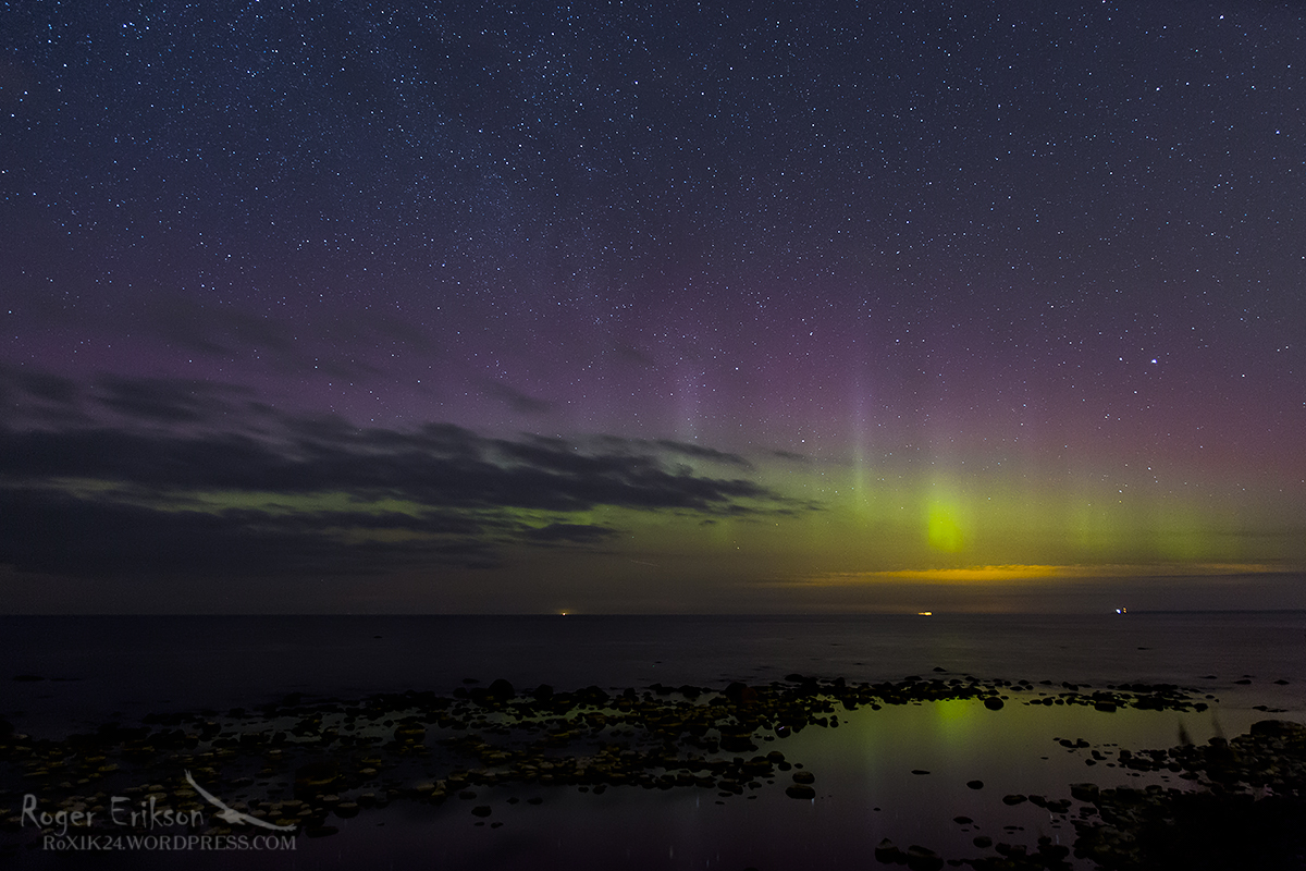 Eile enne hilis-ööd kostitati meid taas päikesetuultega. Õnneks klaaris õhtuks ka taeva kenasti ära, pisut pilvi küll oli, kuid see ei häirinud, pigem aitas kaasa :). Rõõm oli tõdeda, et sain sellel aastal samuti käe valgeks. Tegelikult olin “objektil” juba väga varakult, et mõnda uut perspektiivi leida. Kui olin juba lootust kaotamas, oli näha taeva helenemist. Huvitaval kombel hakkas taevas pigem kirde suunas helendama, tavaliselt tulevad värvid kas põhja või pigem loode suunas. Aktiivsem mäng kestiski umbes 30min ja siis vaibusid värvid taevas. Tore oli tähistaeva all taas olla, nautisin õhtut täiel rinnal :).