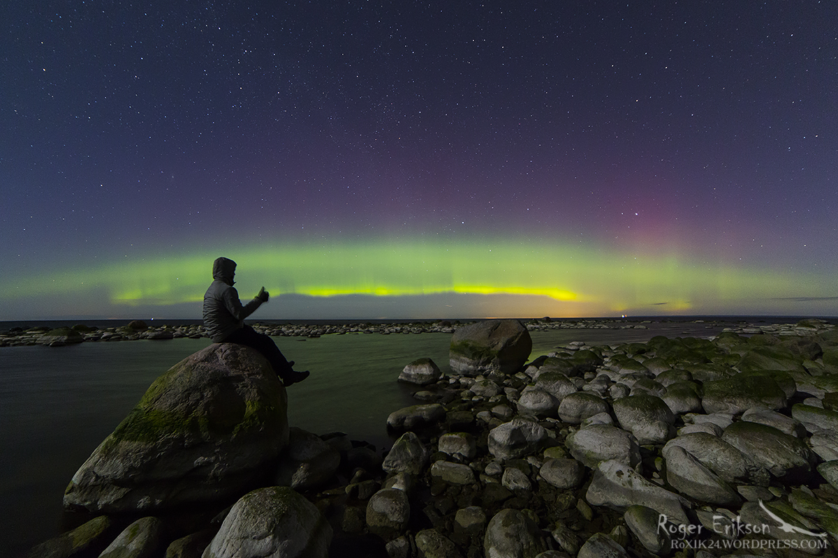 Millal see nüüd oligi, kui sai kurbusega pilvevangis istutud ja eelmise aasta virmalise-pilte postitatud. Nüüd on meid juba nädalajagu hoitud ärkvel ja pakutud meile värvidemängu. Õnneks läks ka eile õhtul taevas selgeks ja sai pingsalt graafikuid jälgitud ning läbi virmaliste foorumist antud vihjete peale õigel hetkel mere äärde sõidetud. Nii kui randa jõudsin, oli kaareke taevas. Õnneks oli kaamera eelnevalt paika sätitud ja sai kiirelt klõpsima asuda. Päris põnev oli, nii umbes 2h jagu. Siis käis 2 suuremat lainet meist üle, millest esimene oli ikka päris nauditav, väga ere ja palja silmaga selgelt nähtav. Nii ei jäänudki muud üle, kui kaamera õigesse kohta klõpsima panna ja rahus värvidemängu nautida :).