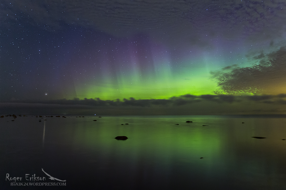 Hakkab jälle peale. Ülisuur Päikese krooniauk on maa poole end keeramas, mistõttu võib terve nädala jooksul suure tõenäosusega taevas virmalisi näha. Seda muidugi juhul, kui ilm meid soosib :). Eile õhtul olid näidud head ja taevas paistis kodust samuti selge. Linnast välja liikudes tekkis aga udu ja ikka nii paks, et nähtavus nullilähedane. Kuid kuna sättisin end taas mereranda, siis uskusin, et küll meretuul selle udu rannast ära puhub :). Nii oligi, kuid väga rõske oli seal sellegipoolest. Uskumatul kombel oli ka meri täiesti rahulik, mis andis väikse lootuse virmalisi ka veest peegeldatuna näha. Õnneks ei pidanud pettuma ja pisut enne 23 läks taevas heledaks, millele järgnes silmaga nähtav sammaste liikumine. Olgugi, et taevas oli päris palju pilvi, mis mu ürituse nässu oleks võinud keerata, halastati mulle seekord ja lubati 15 minutiks see show ära vaadata :D. Ka ajalises mõttes sai täiesti normaalsel ajal magama…lõpp hea, kõik hea :).