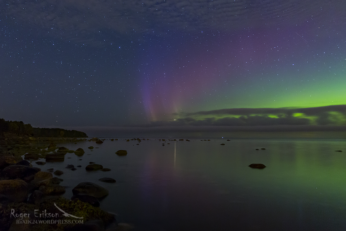 Nõrgemapoolsed virmalised tekitavad meie põhjataevasse tavaliselt roheka kaare. Huvitaval kombel on aga selle kaare ääred alati põnevalt teist värvi, näiteks lillad. Tänane pilt just seda hetke kujutabki. Antud pildil nähtavad värvid olid suurema mängu jäägid, mis peagi taevast kadunud olid. Kena meenutus septembri lõpust.