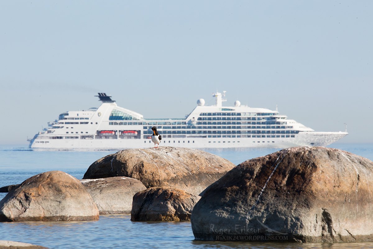 Vahest ei lähe muidugi hästi. Üritad saada pilti “Lind omas keskkonnas”, kuid kahjuks trügib inimtegevus aastatega aina enam moel või teisel pildile. Nagu ka allpool oleva pildi tegemise ajal, ilmus suur kruiisilaev just sel ajal kaadrisse, kui lindu pildistasin. Aitasin siis ka tehniliselt pisut kaasa, et pilt saakski nö mittelooduslik :). Merisk tegemas hooldust oma sulgedele, samal ajal tagaplaanil kohe sadamasse jõudmas suur kruiisilaev :).