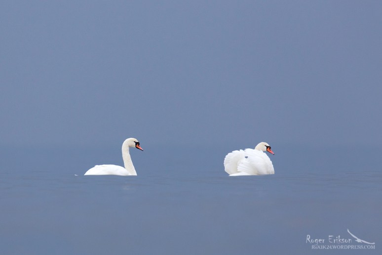 Laupäevane ilm oli pigem soe ja vesine, kuid täiesti vaikne. Mere äärde jõudes tabas mind imeline vaatepilt, mida iga päev ei kohta- meri ja taevas olid sama värvi! Oli vaid tarvis leida pildile ka modell, kes mind pildi vormistamisel aitaks. Paar kühmnokk-luike olid selleks ideaalselt sobivad, mistõttu sündiski täna esitletav pilt :). Veebruar 2018.