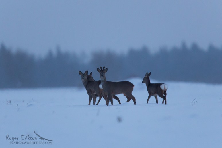 Hetkel on kitsi näha päris palju, nii hommiku,- kui ka õhtutundidel. Kitsed on kogunenud päris suurtesse gruppidesse. Sel talvel on õnnestunud kohata ka üle 20 pealist kampa. Tänasel pildil nähtav väiksem kitsegrupp oli tegelikult viimases valguses liikumas ühe teise grupi suunas, kellega pool tundi hiljem edukalt liituti. Pilt tehtud pool tundi peale päikeseloojangut. Veebruar 2018.