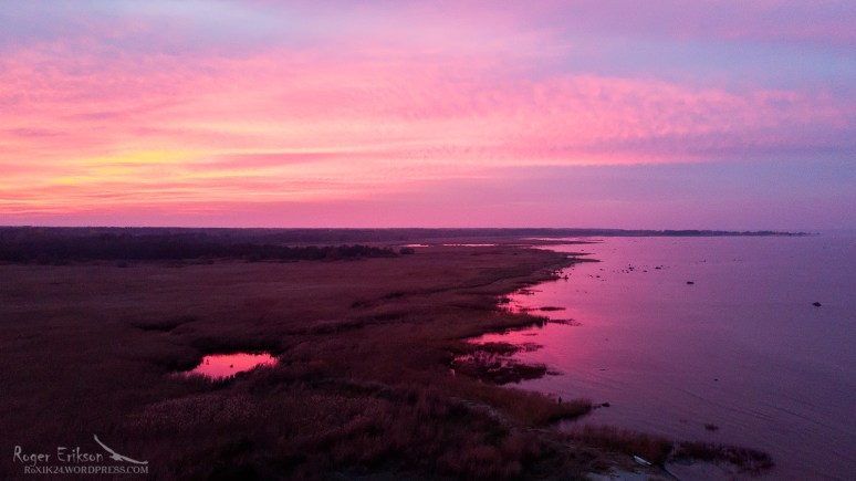 Ühel õhtupoolikul oktoobris, olin taas mere ääres rändelinde piilumas. Miskipärast oli merel täielik vaikus… nii tuule, kui ka rändelindude osas. Tänu sellele oli suurepäraselt kuulda kõiksugu hääli roostikus, mistõttu õnnestus näiteks kohata roohabekaid. Sellest kirjutasin ühes varasemas postituses. Aga sellega mu päev veel ei lõppenud. Kui terve päev oli pilves ja selline sombune taevas, siis loojangu ajal tõmbas taeva selliseid värve täis, mille peale oma linnuotsingud varem lõpetasin ja hoopiski drooni õhku lennutasin. Vaatepilt oli täpselt sama vinge ja värviline, nagu tänaselt pildilt näha võib :). See ongi peamine põhjus, miks endale väikse drooni muretsesin, et ta minuga igal pool kaasas oleks ning just sellistel momentidel need hetked ka pildiks vormistada õnnestuks. Oktoober 2018.