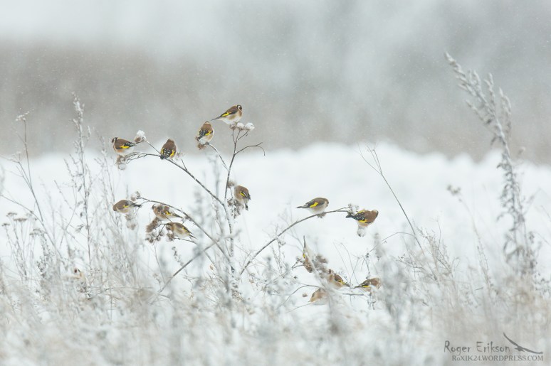 Värvilised ohakalinnud on kogunenud söögi juurde. Lumine keskkond toob nende kireva sulestiku ka kenasti esile. Detsember 2018.