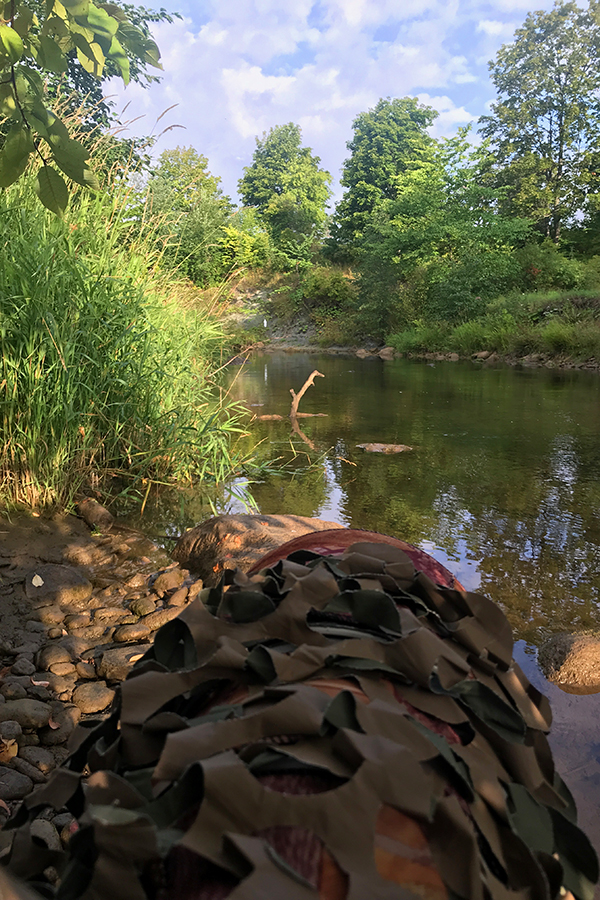 Järgmisel hommikul olin kohe päikesetõusu järgselt kohal, ning sättisin planeeritud võttepaigale ette varjevõrgu, et lind kaldal istuvat kuju väga selgelt ei näeks. Nimetatud oksad jäävad antud pildist paremale ning on tehtud võtteplatsi tagant. Paljud loodusfotograafid kasutavad selleks puhuks lausa telke, kuid antud kohas oleks see olnud keeruline, kuna olustik ei soosinud.