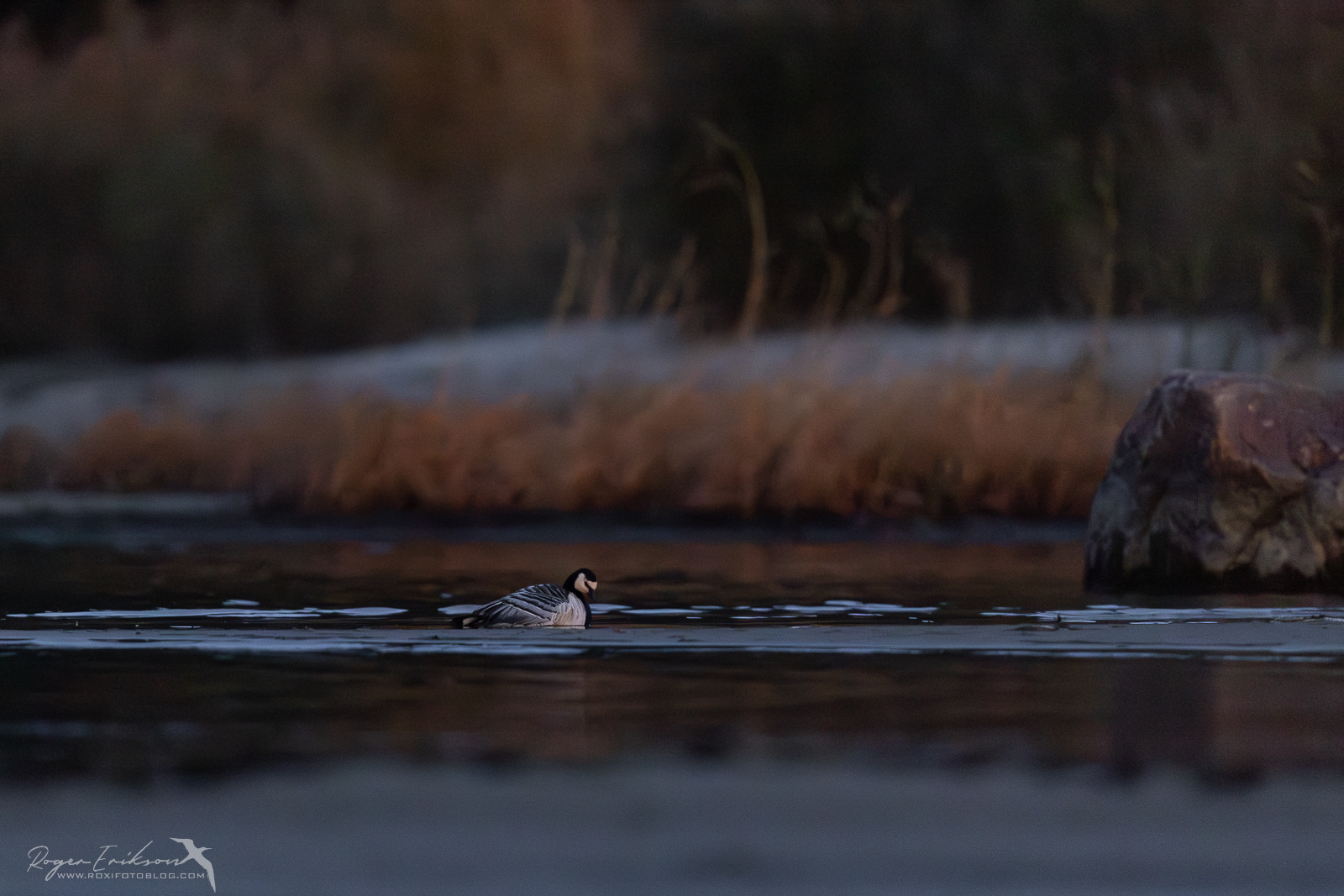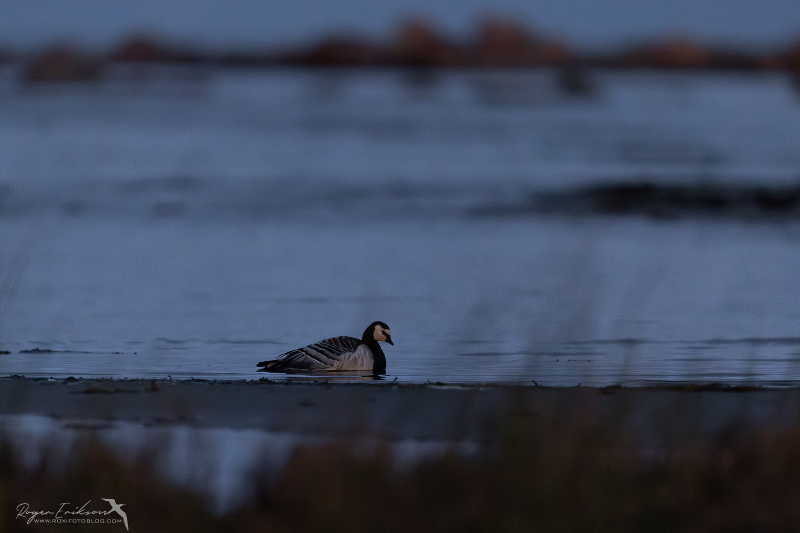 Kuna oli juba piisavalt hämar, hakkasin tagasi sammuma. Teel autoni nägin huvitavat vaatepilti. Kaugelt tundus, et üks lind oli ranniku lähedal liikumatult. Tõstsin objektiivi ning nägin üksikut valgepõsk-laglet vees passimas. Polegi täpselt teada, kas tal oli midagi viga või oli oma rändeteel nii ära väsinud, et isegi mu möödumisest välja ei teinud. Igal juhul sinna ta jäi ning pole teada, mis temast sai. Ma siiralt loodan, et tegu polnud eelpool postitust alustades meie turistide poolt vigastatud ohvriga. Igal juhul ta elas ja liigutas ning jääme ikka lootma, et oli lihtsalt väsinud lind ning hommikul jätkas oma teekonda soojemasse kohta.