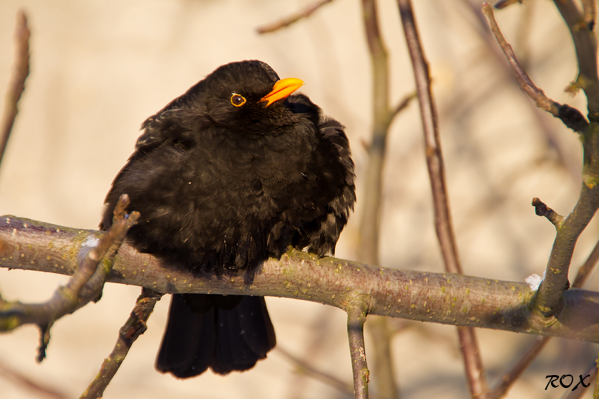 Musträstas kössitamas oksal loojangupäikse käes, et külmal päeval natukenegi sooja saada. Jaanuar 2014.