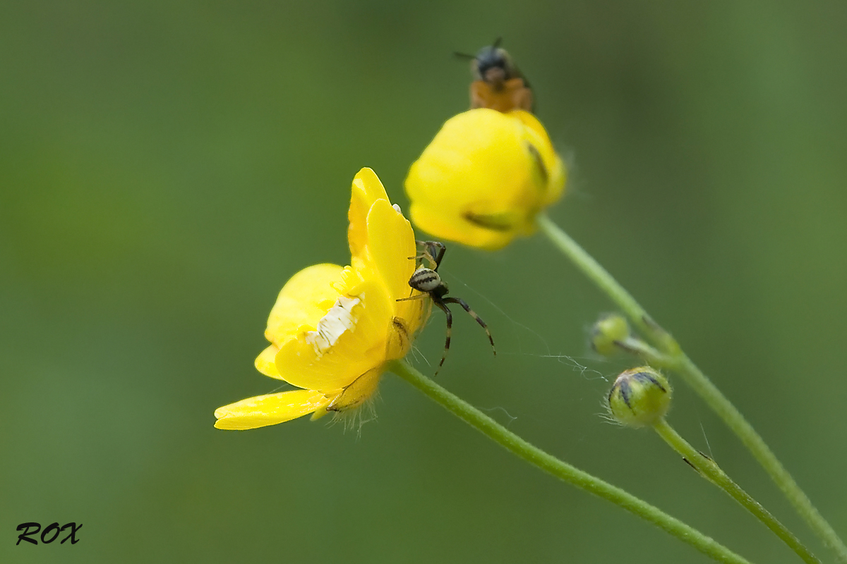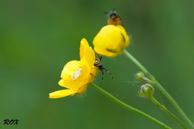 Sattusin ühel korral jube laheda hetke peale. Kui proovisin ühte krabi-ämblikku pildistada kollase lillenupu peal, siis maandus naaberõiele just üks herilane. Pildi effekt oleks olnud seda suurem, kui herilased ämblikke sööks :). Siis tekiks selline kiskja varitsuse moment sisse. Kahjuks ei ühenda neid isendeid mitte miski, kumbki teineteist ei jahi…pigem on need õied teineteisele tavaliseks elukeskkonnaks :). Aga tore kaader sellegipoolest 🙂